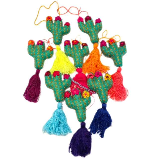 メキシコ・オアハカで作られたフェルトの刺繍サボテンチャーム。 鮮やかな色のフェルト生地で作られた優しいフォルムと、様々な色の糸で刺繍された可愛らしいデザインがなんともたまらない一品です。 バッグにチャームとして付けたり、インテリアとして飾るのもおすすめ。 ※フリンジの色で商品分けしていますが、フリンジの色味が写真と若干違うものもあります。 ※花の色と吊紐はアソートで選択できません。 (写真の物が残っていれば優先的にお選びいたしますが、色味の希望があれば注文の際に記載いただければ、在庫があれば希望に近いものをお送りいたします。) サボテンのみ 長さ約11cm フリンジ込み(吊るし紐部分含まず) 約22cm