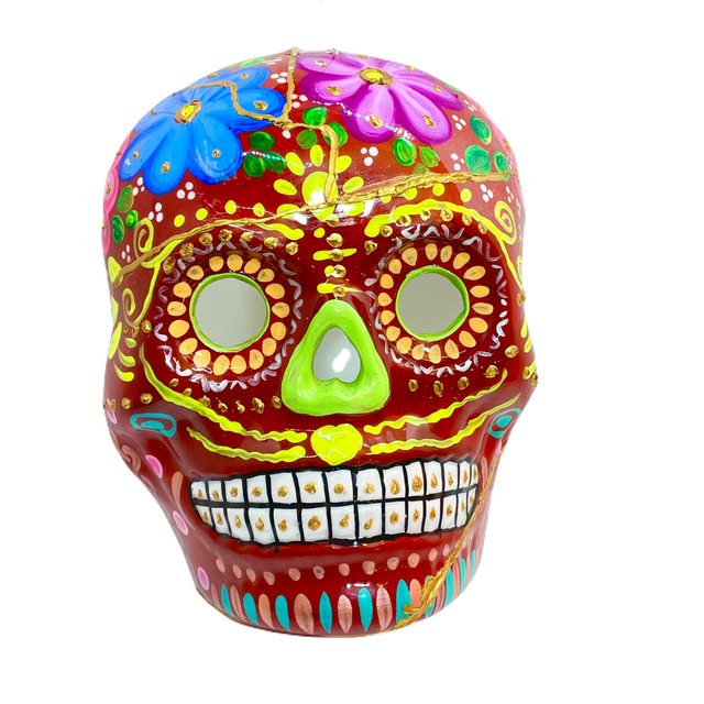 メキシコを代表する民芸品といえばこれ、陶器で作られたカラベラです。 見た目の通り死者を意味するものですが、メキシコのカラベラは怖い物ではありません。 メキシコでは人は死ぬと骸骨(カラベラ)になり、現世と全く同じ生活を死者の国で送り、一年に一度「死者の日」には現世に帰って来ると信じられていますが、現世と死者の国では一つ決定的な違いがあります。 それは死者の国には悲しいこと、嫌なことは一切無いということ。 死者の国では楽しく嬉しく幸せなことしかなく、死ねばハッピーという考えが古くからメキシコ人たちには根付いています。 そのような考えから、カラベラは皆楽しそうな表情で作られて、幸せの象徴とされています。 すべて手作り、ハンドペイントで作られているため、一つとして同じものがありませんので、お好きなデザインを見つけたら迷わずゲットすることをおすすめします。 ※手作り品のため、汚れや色ムラなどございます。 縦 約21cm 横 約16cm 厚み 約6cm