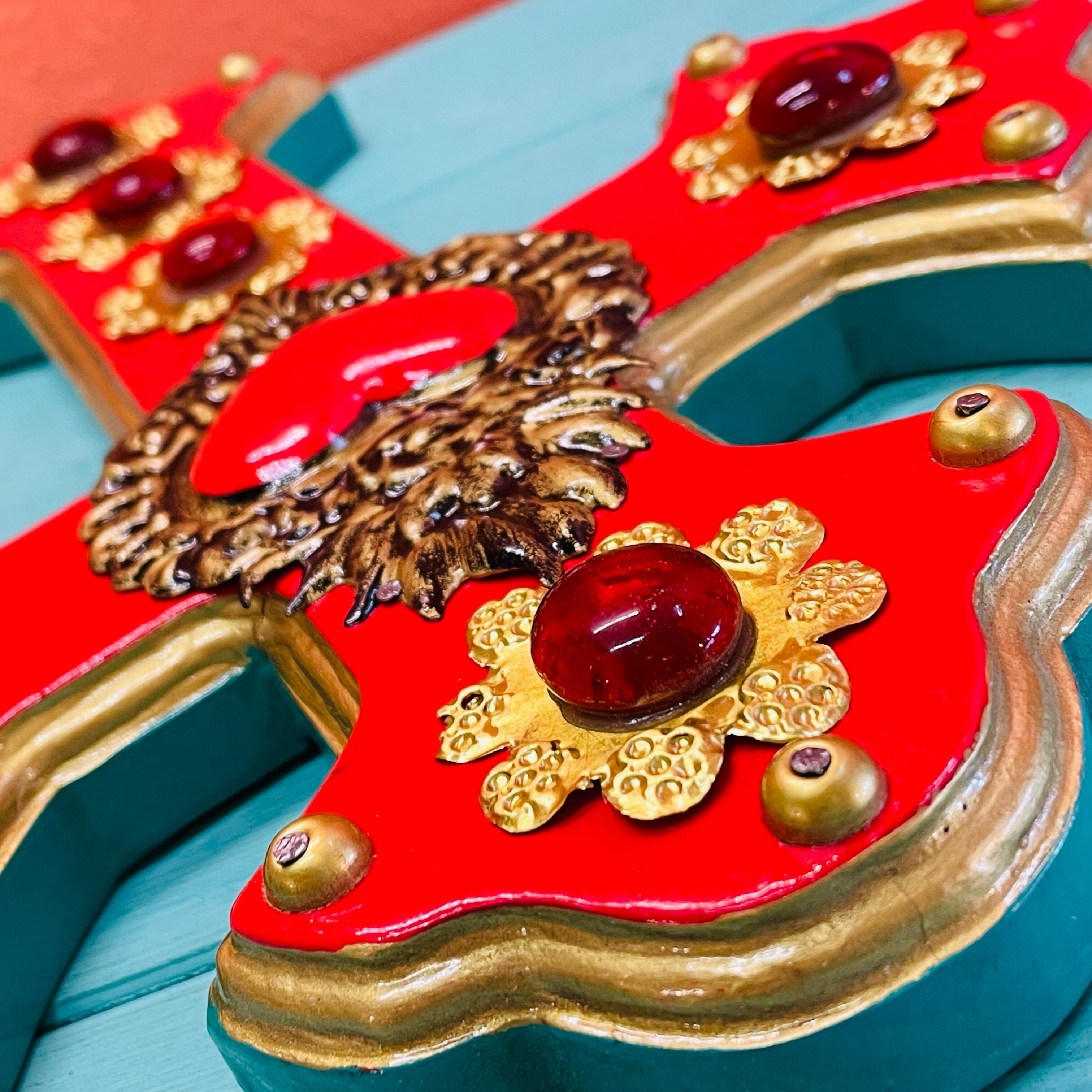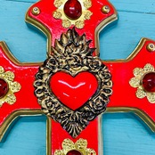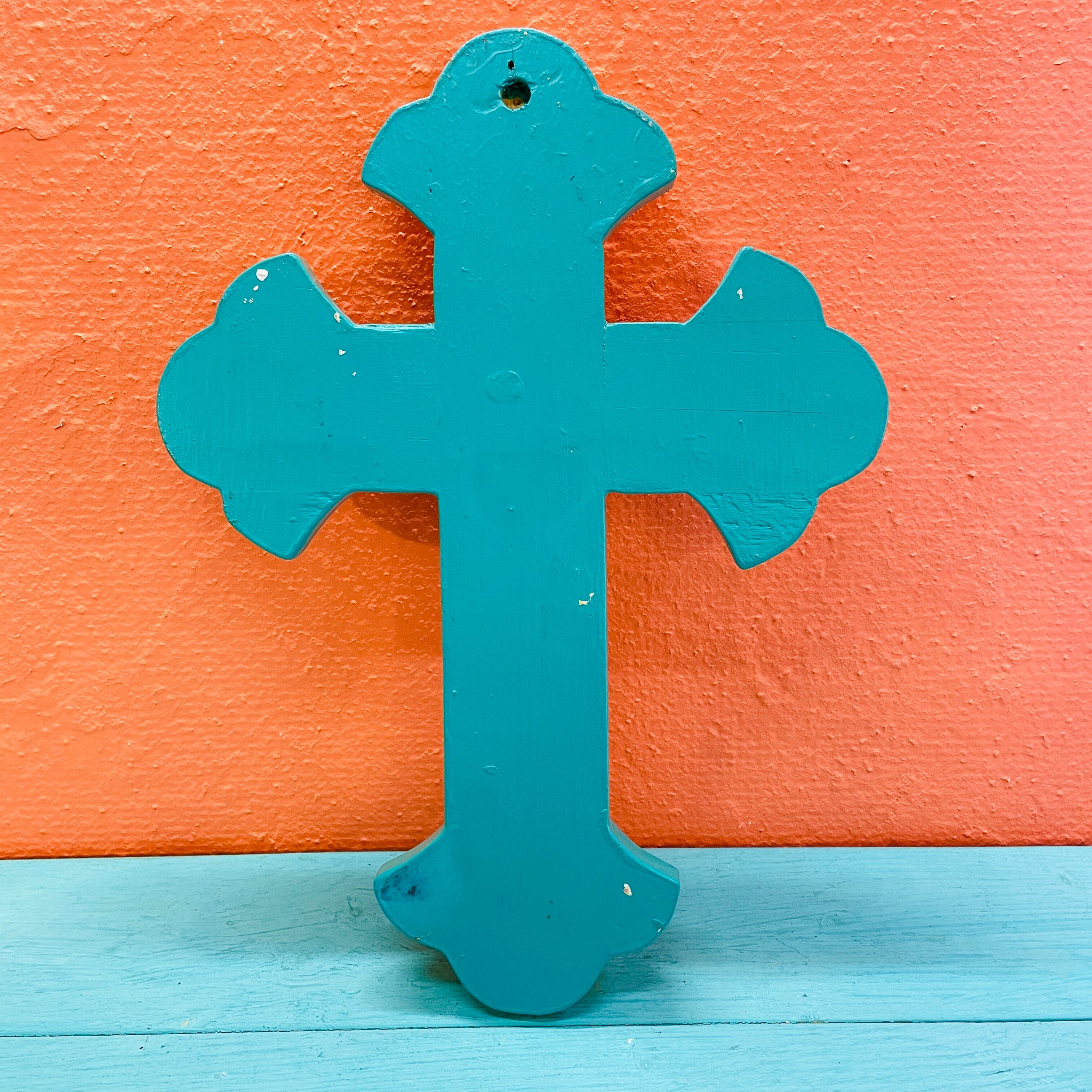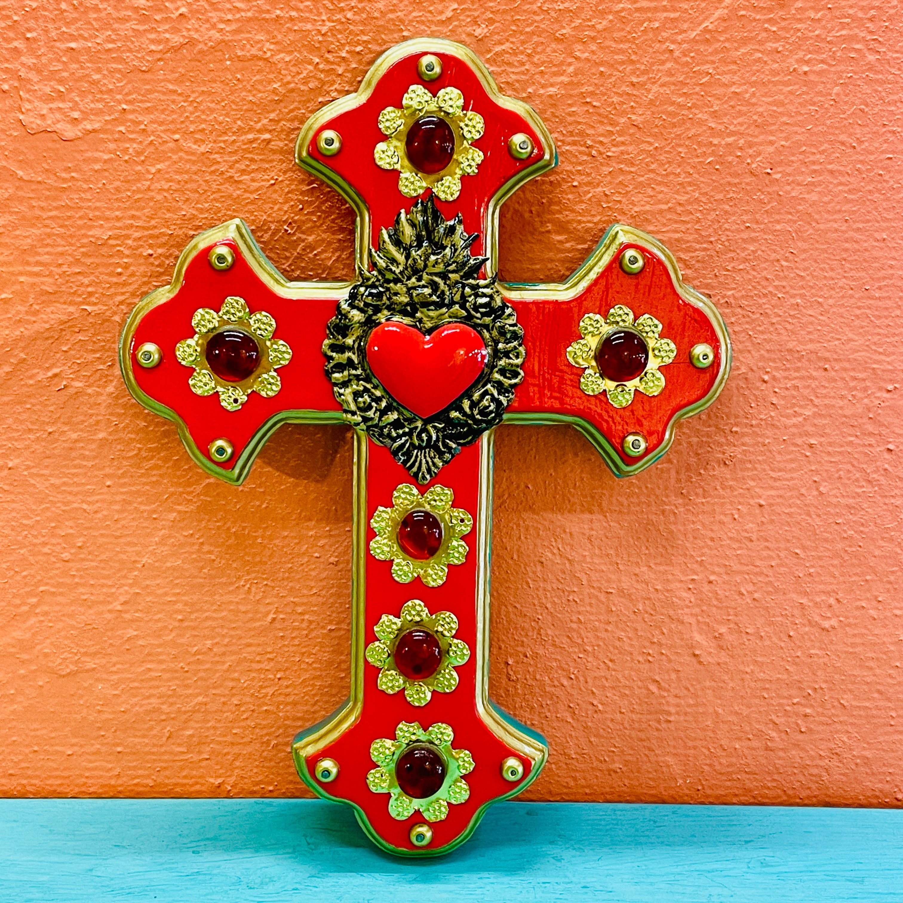 鮮やかな赤色と縁のアイスグリーンが目を引く木製の壁掛け十字架。