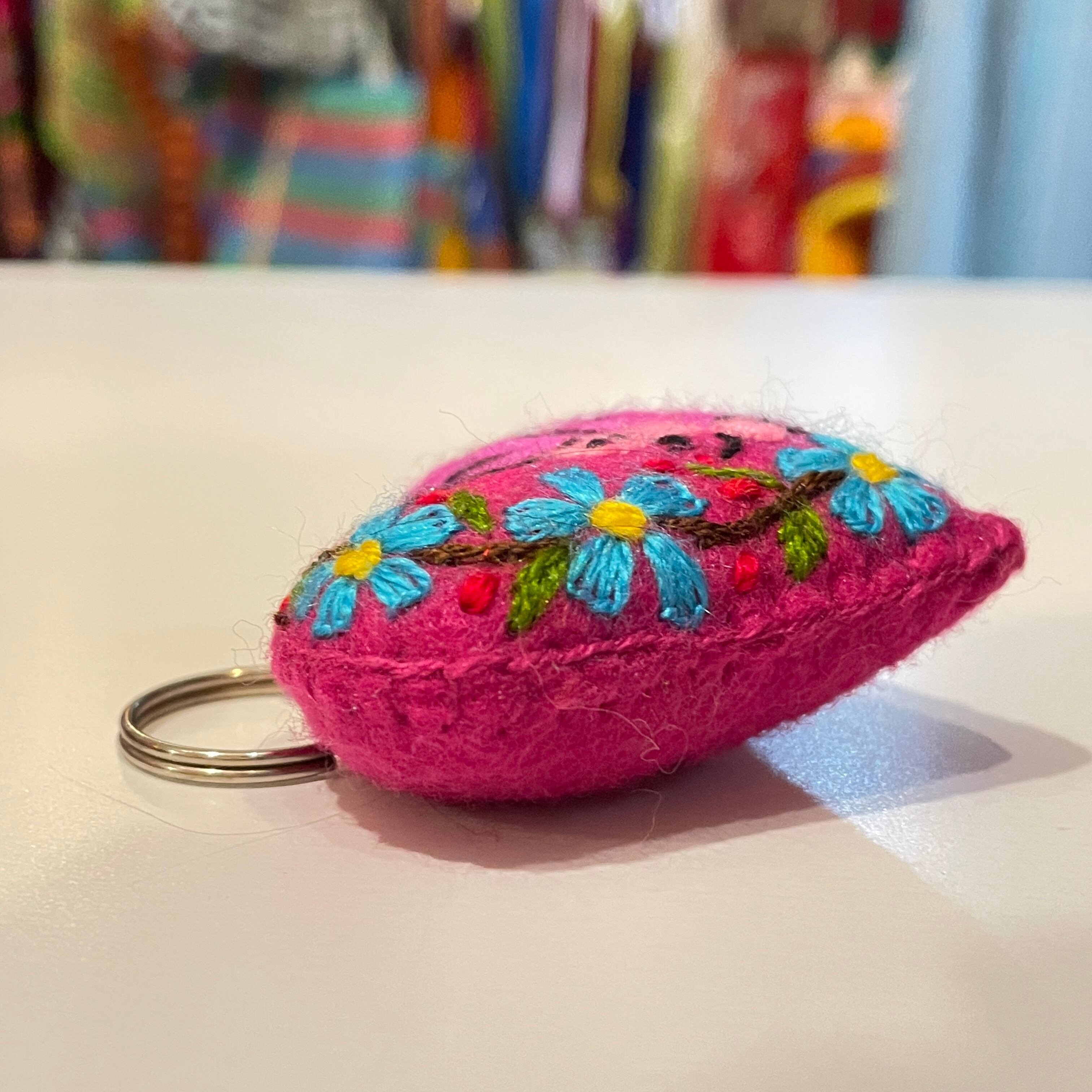 メキシコ・オアハカで作られたフェルトの刺繍ハートキーホルダー。