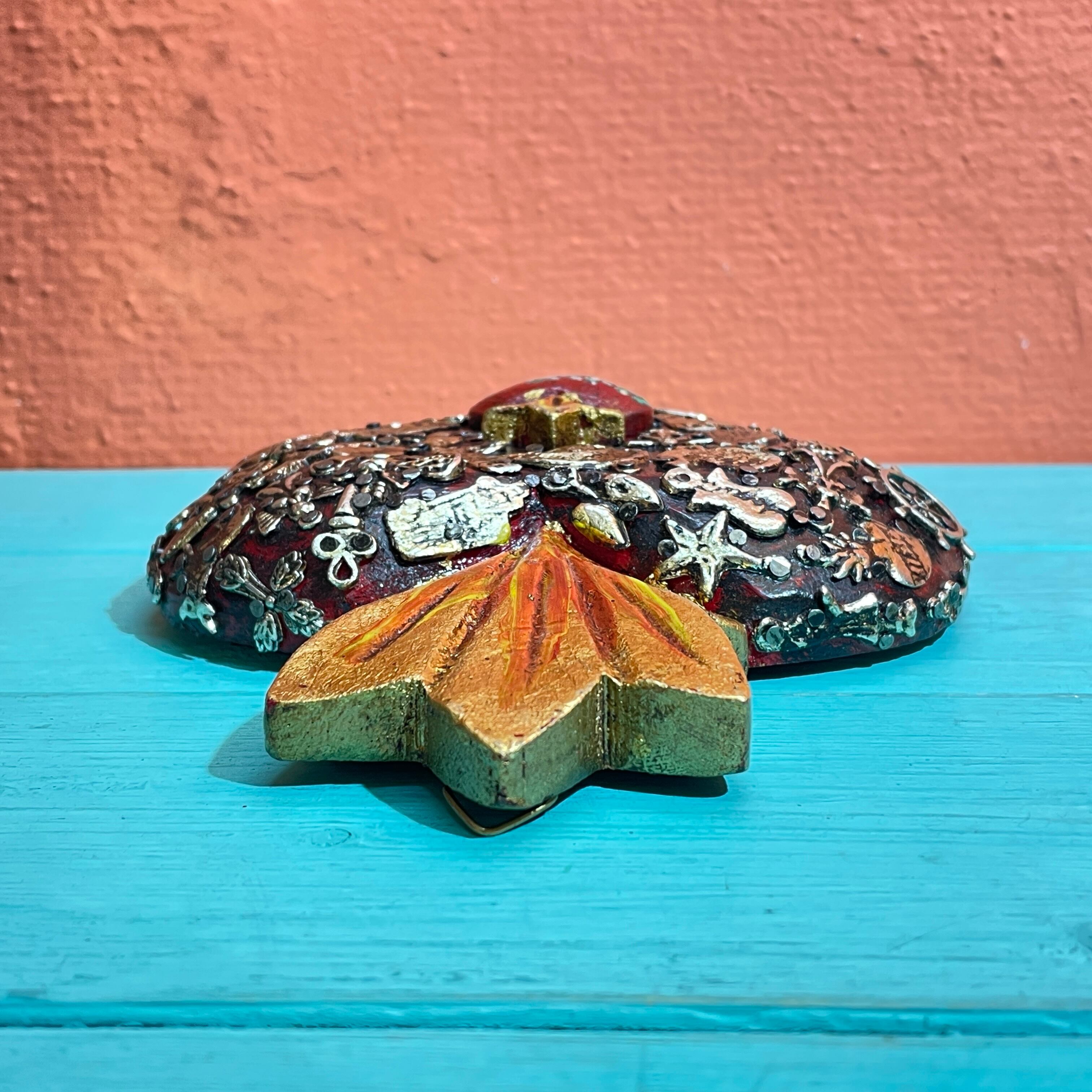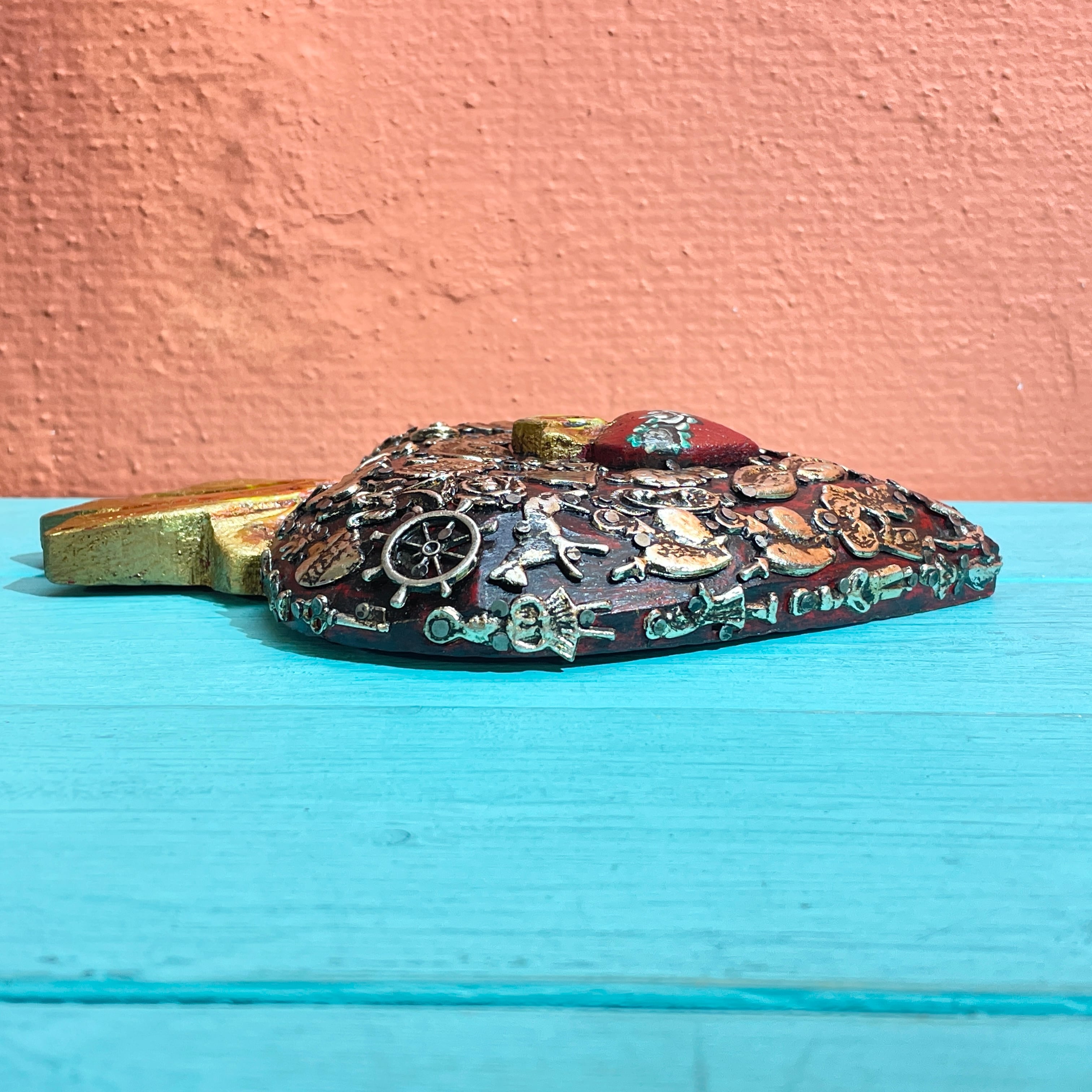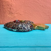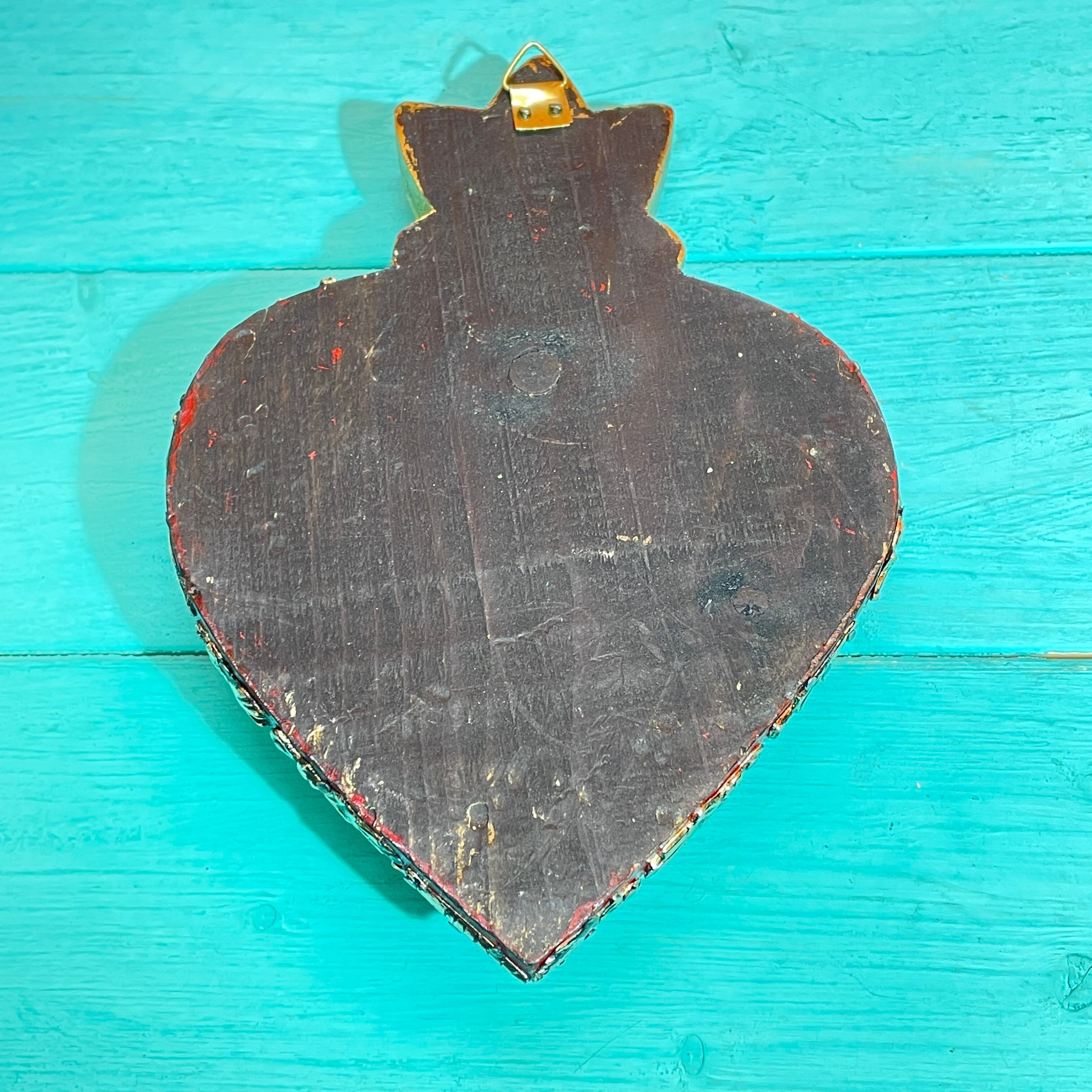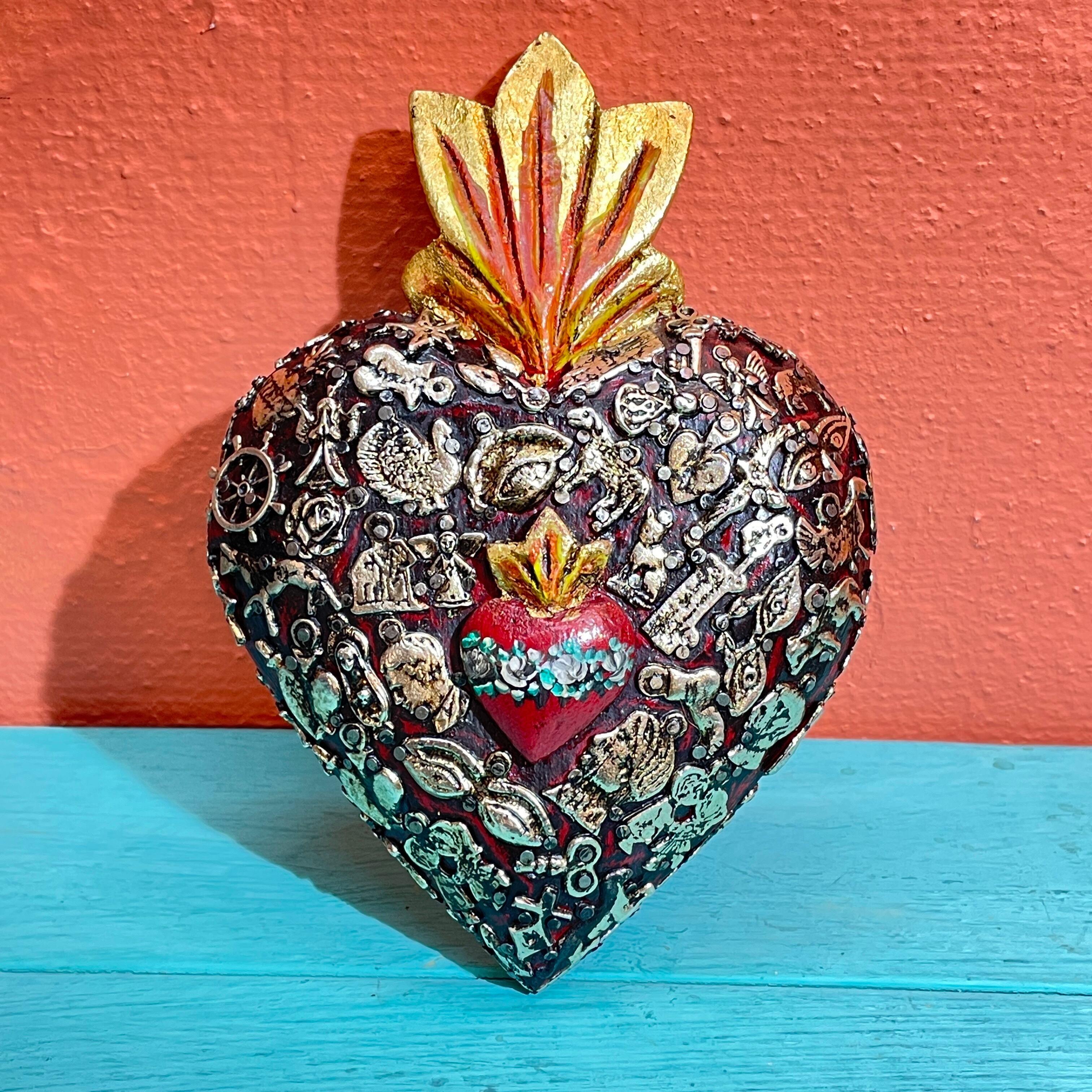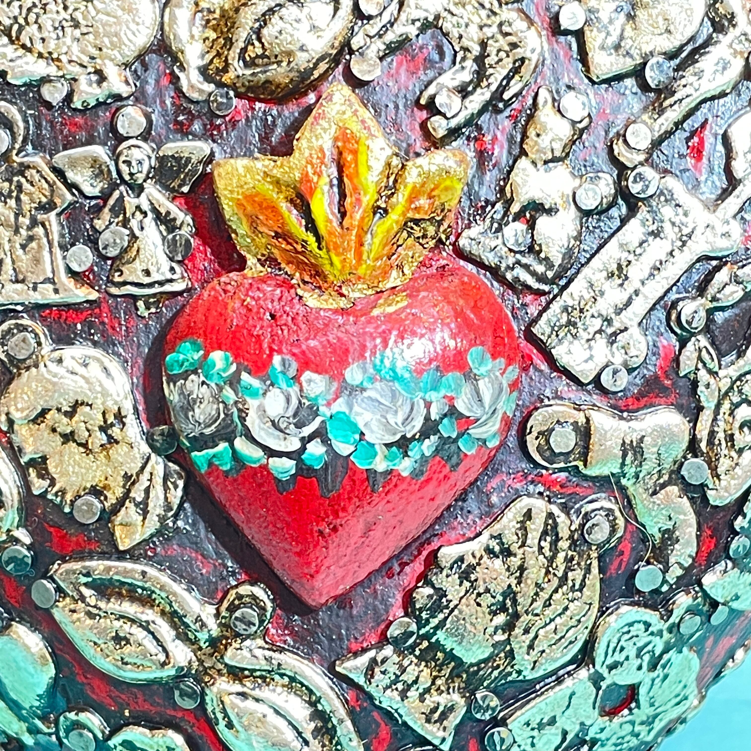 ミラグロとはスペイン語で「奇跡」の意味で、木製の十字架やコラソンなどのモチーフにたくさんの小さな金属製チャームを釘で打ち付けたものです。