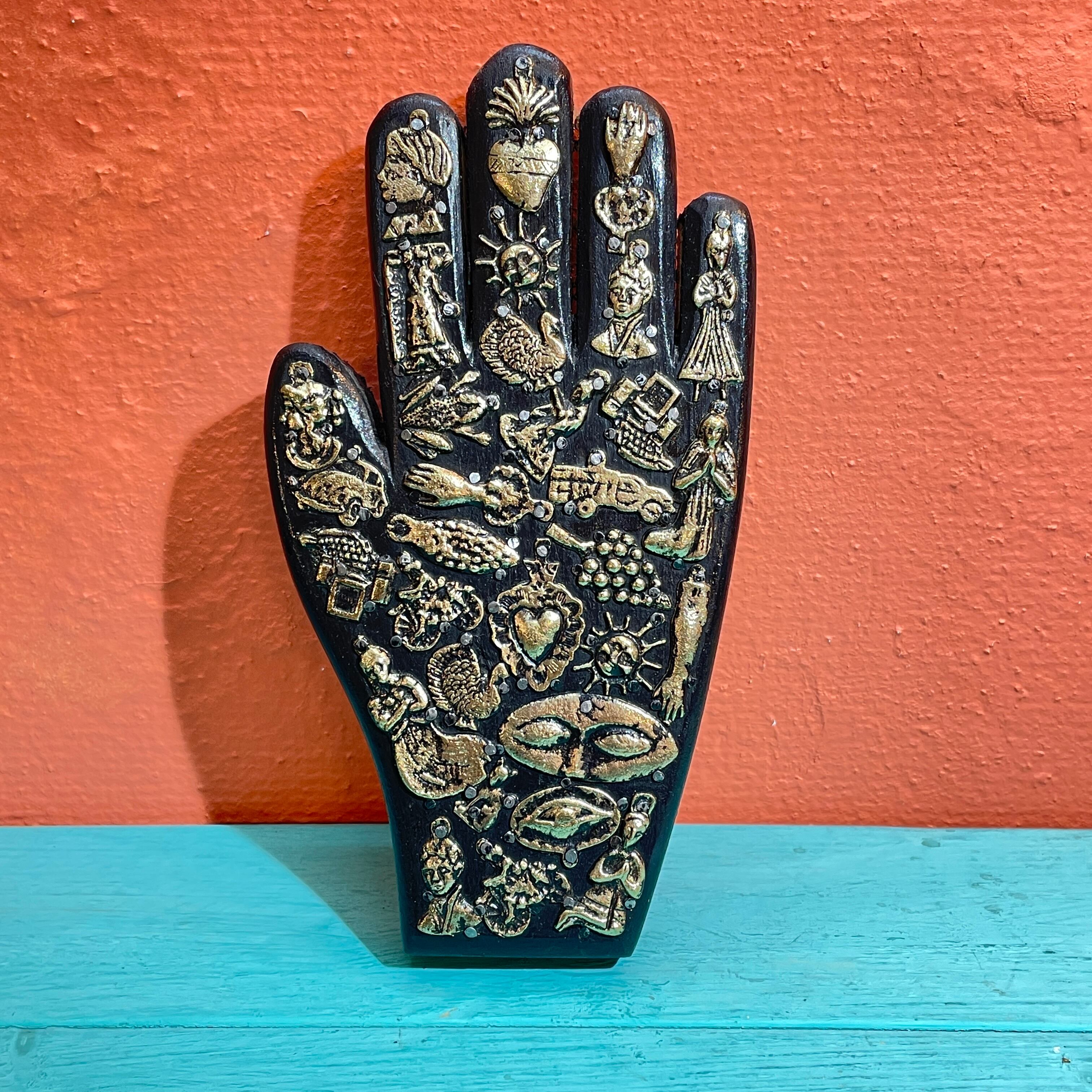 ミラグロとはスペイン語で「奇跡」の意味で、木製の十字架やコラソンなどのモチーフにたくさんの小さな金属製チャームを釘で打ち付けたものです。