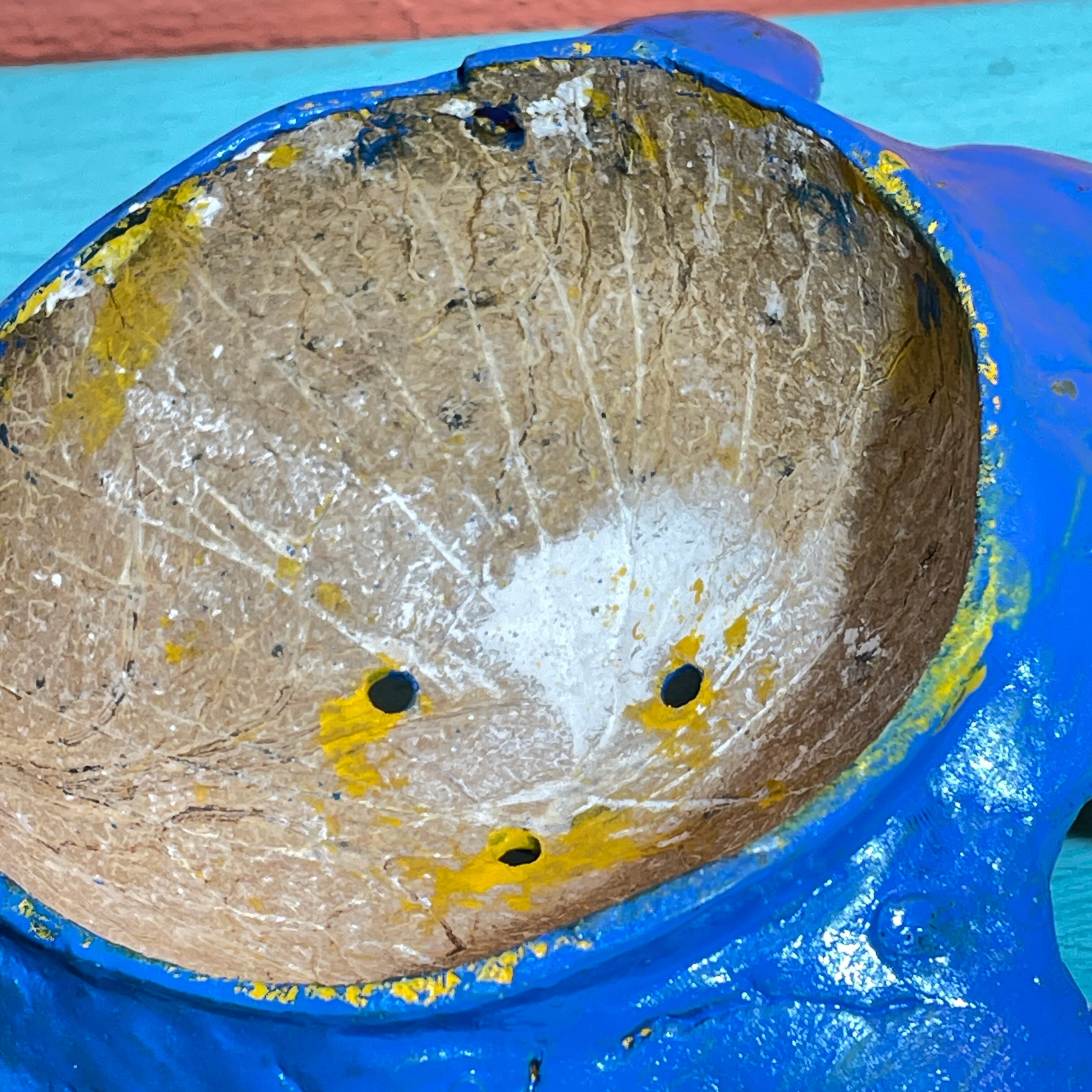 こちらはココナッツの殻のようなもの(裏面から見ると植物の繊維のようなものが見えますが定かではありません)に紙粘土のようなもので装飾を付け加えた壁掛けです。