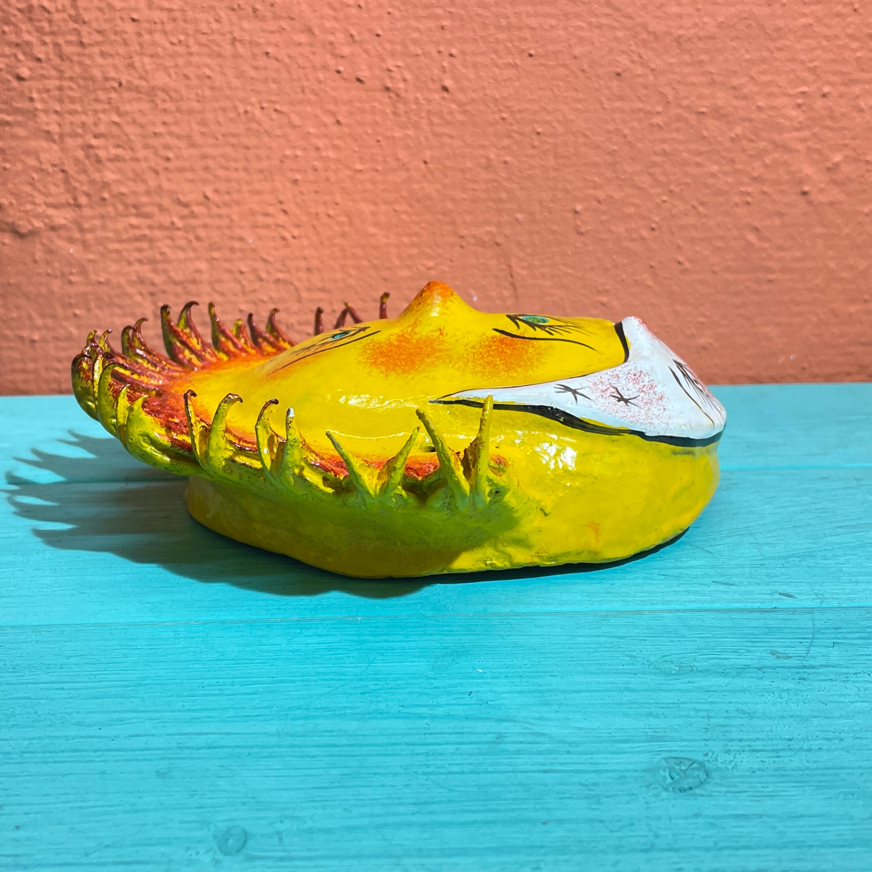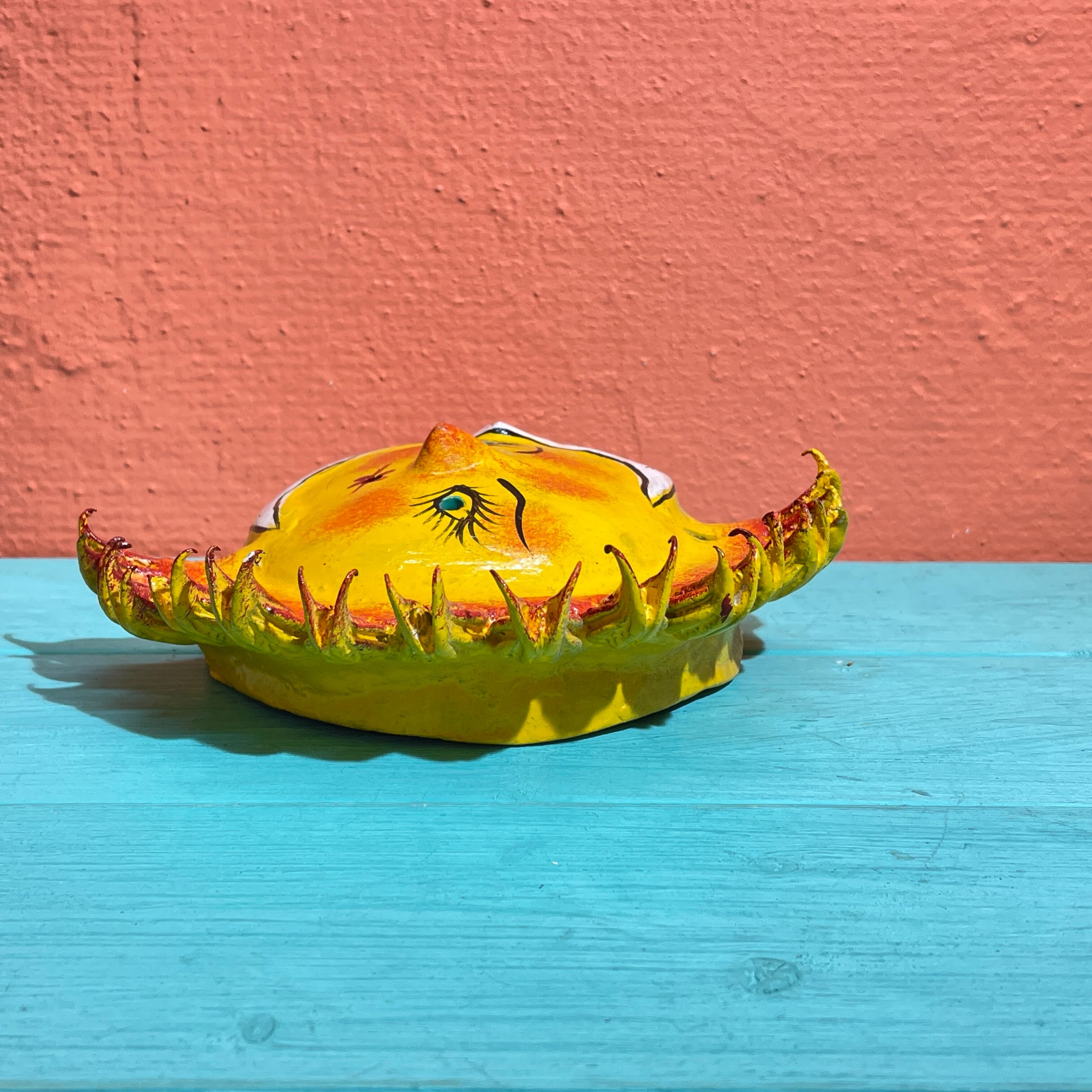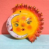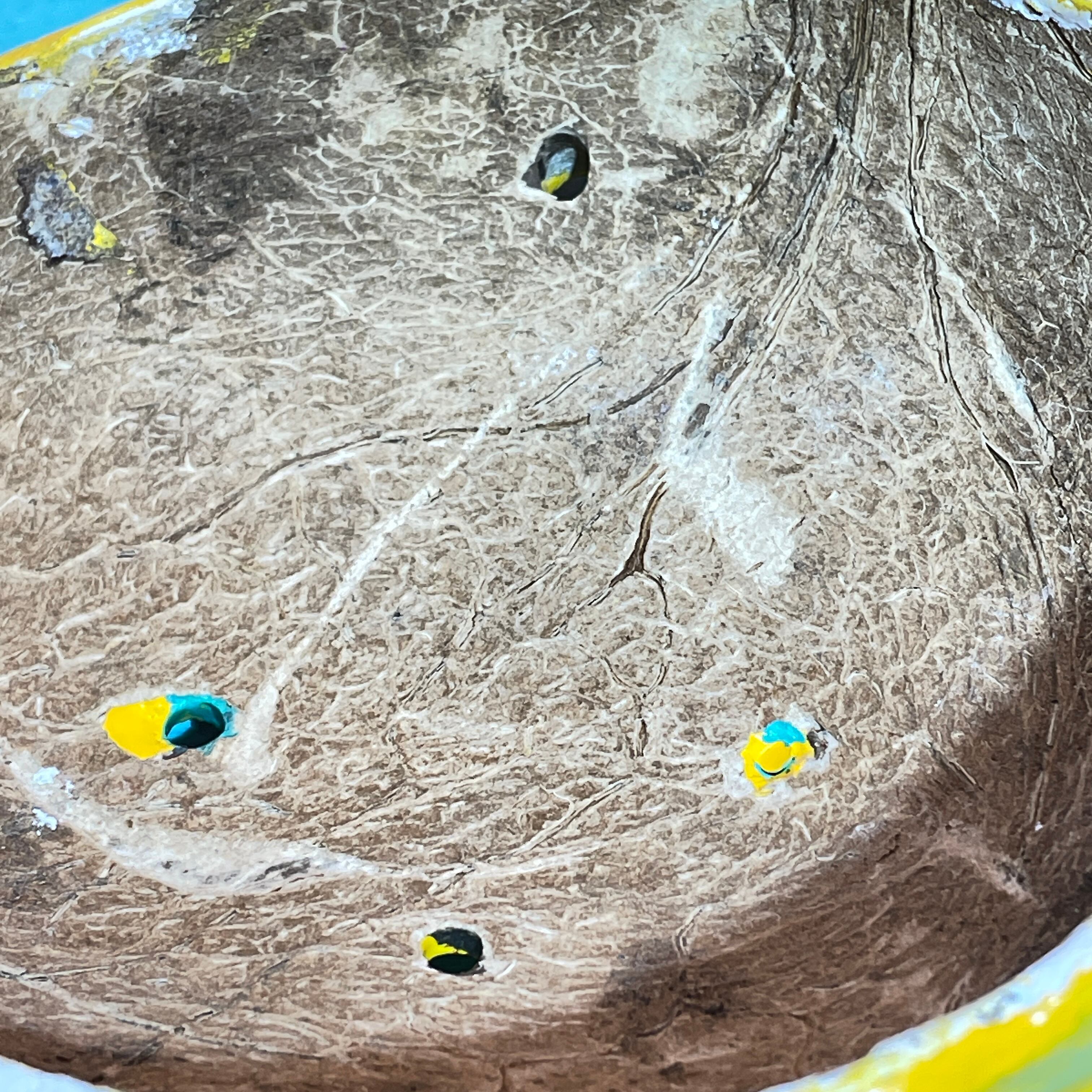 こちらはココナッツの殻のようなもの(裏面から見ると植物の繊維のようなものが見えますが定かではありません)に紙粘土のようなもので装飾を付け加えた壁掛けです。